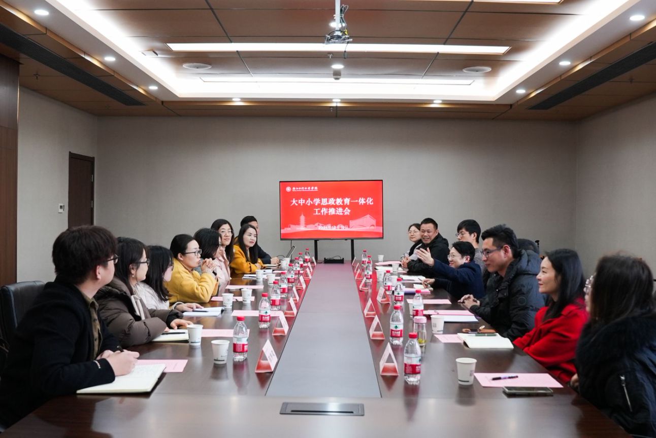 为进一步深入推进大中小学思政教育一体化工作,12月18日上午,马克思主义学院在河长大厦组织召开大中小学思政教育一体化工作推进会。马克思主义学院领导及教师代表,南浔区教育局领导,钱塘区及南浔区大中小学思政教育一体化结对学校领导与教师代表,人民网浙江频道相关负责人齐聚一堂,共同交流研讨大中小学思政教育一体化发展的有效举措。会议由米兰官网马克思主义学院党总支书记、院长王伟英主持。