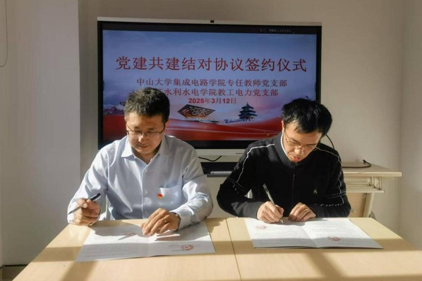 会上,米兰官网电气学院教工电力党支部与中山大学集成电路学院专任教师党支部签署了党建共建协议。双方将以“党建引领创新发展”为主题,构建“理论联学、活动联办、业务联动”的合作机制,为协作开展科研攻关提供坚强的组织保障。