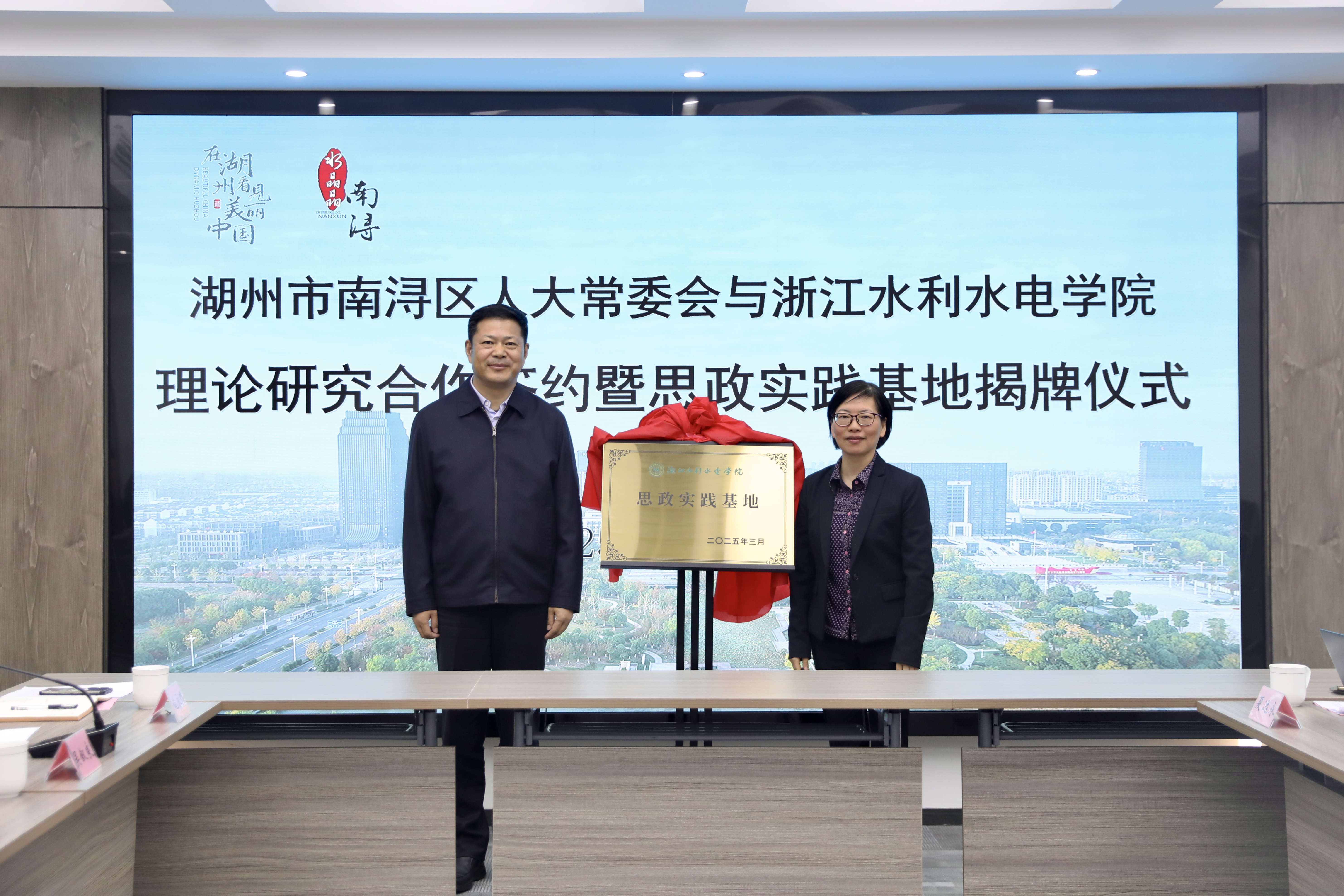 3月12日下午,学校与湖州市南浔区人大常委会理论研究合作签约暨思政实践基地揭牌仪式在南浔区浔溪镇人大联络站举行。校党委副书记唐远彤、马克思主义学院院长王伟英、副院长吴卫华、各研究所负责人及相关教研室主任,南浔区人大常委会党组书记陆卫良,区人大常委会研究室主任、社会建设委主任委员宋伟杰等相关领导出席仪式。仪式由区人大常委会党组成员、副主任吴叙良主持。