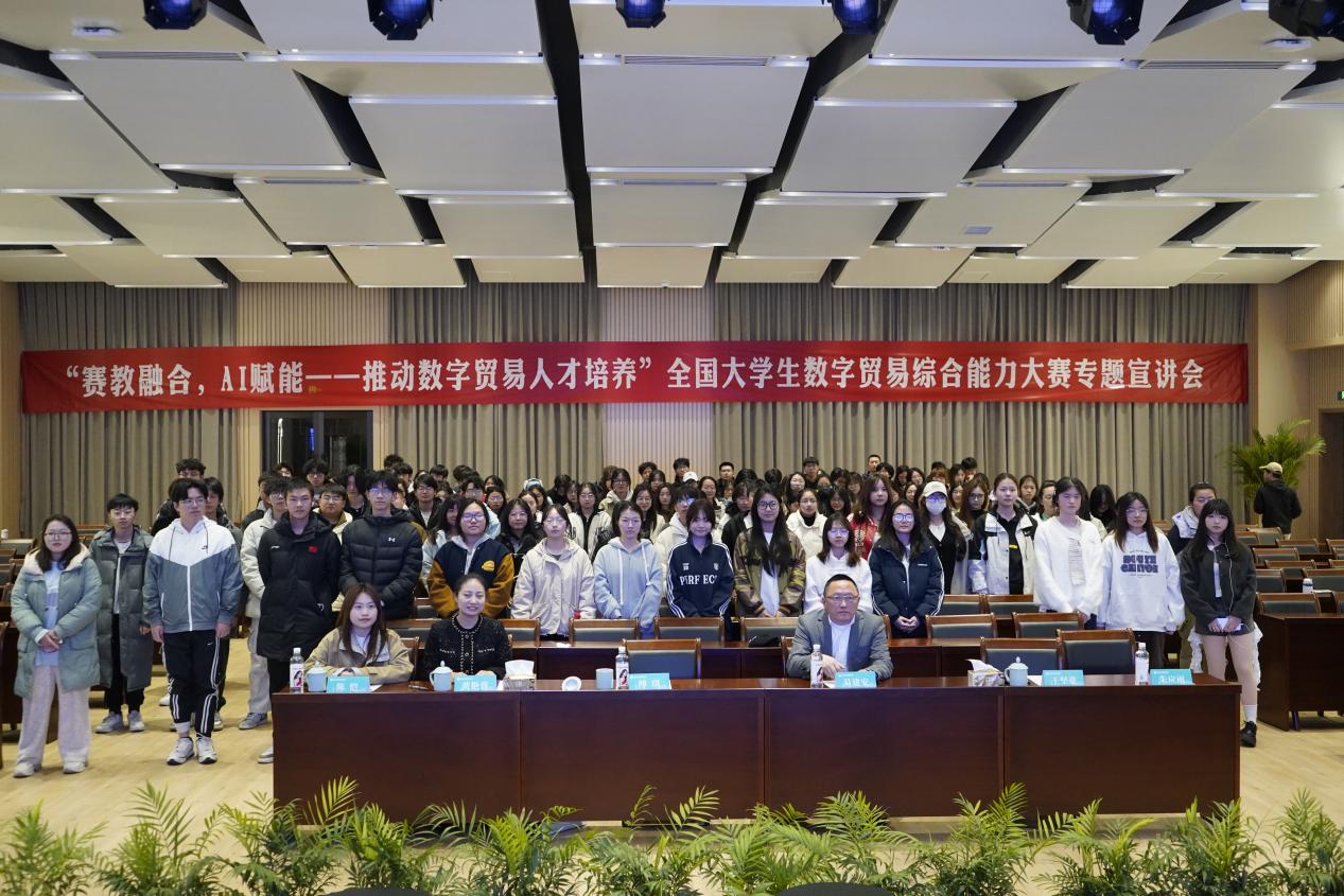 为深化产教融合育人模式,培育数字经济时代新型贸易人才,3月19日晚,经管学院联合全国大学生数字贸易综合能力大赛组委会,在南浔校区思源楼举办主题为“教赛融合,AI赋能——推动数字贸易人才培养”的宣讲会。会议邀请全国商业精英挑战赛国际贸易跨境电商赛道副主任委员、全国大学生数字贸易综合能力大赛易建安秘书长主讲,全校近200名师生参加。