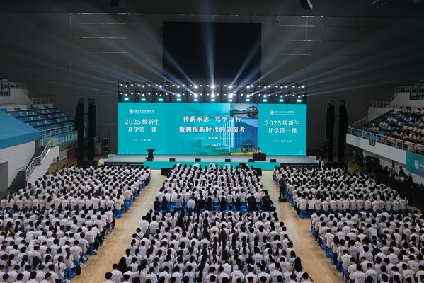 9月15日,校党委书记钱天国以《传薪承志 笃学力行 做拥抱新时代的创造者》为题,为2025级全体新生讲授“开学第一课”。学校相关部门负责人、二级学院学生工作负责人、辅导员代表参加听课。校党委副书记唐远彤主持。