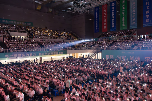 巨幅校旗承载着水院精神在全场目光的聚焦中缓缓入场,现场气氛被推向高潮。新生们的眼眸被旗帜点亮,那份以青春为笔、书写梦想的信念,也在这一刻变得格外坚定。典礼在校歌声中圆满落幕。