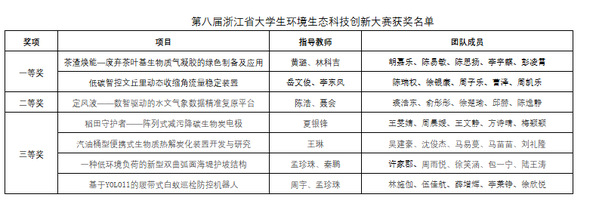 本届大赛由浙江省教育厅、浙江省大学生科技竞赛委员会、浙江省土壤肥料学会、浙江省生态学会等单位联合主办,共吸引了全省 54 所普通本科院校、独立学院和高职院校参赛,推荐省赛项目作品共计 834 项,旨在倡导生态文明理念,引导大学生关注热点环境与生态问题,寻求解决环境生态问题的有效方法及措施,提高大学生的生态环境保护和创新意识。
