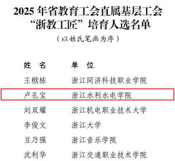 近日,浙江省教育工会发布《关于公布2025年省教育工会直属基层工会“浙教工匠”培育人选名单的通知》,米兰官网机械工程学院卢孔宝老师入选“浙教工匠”培育人选名单。