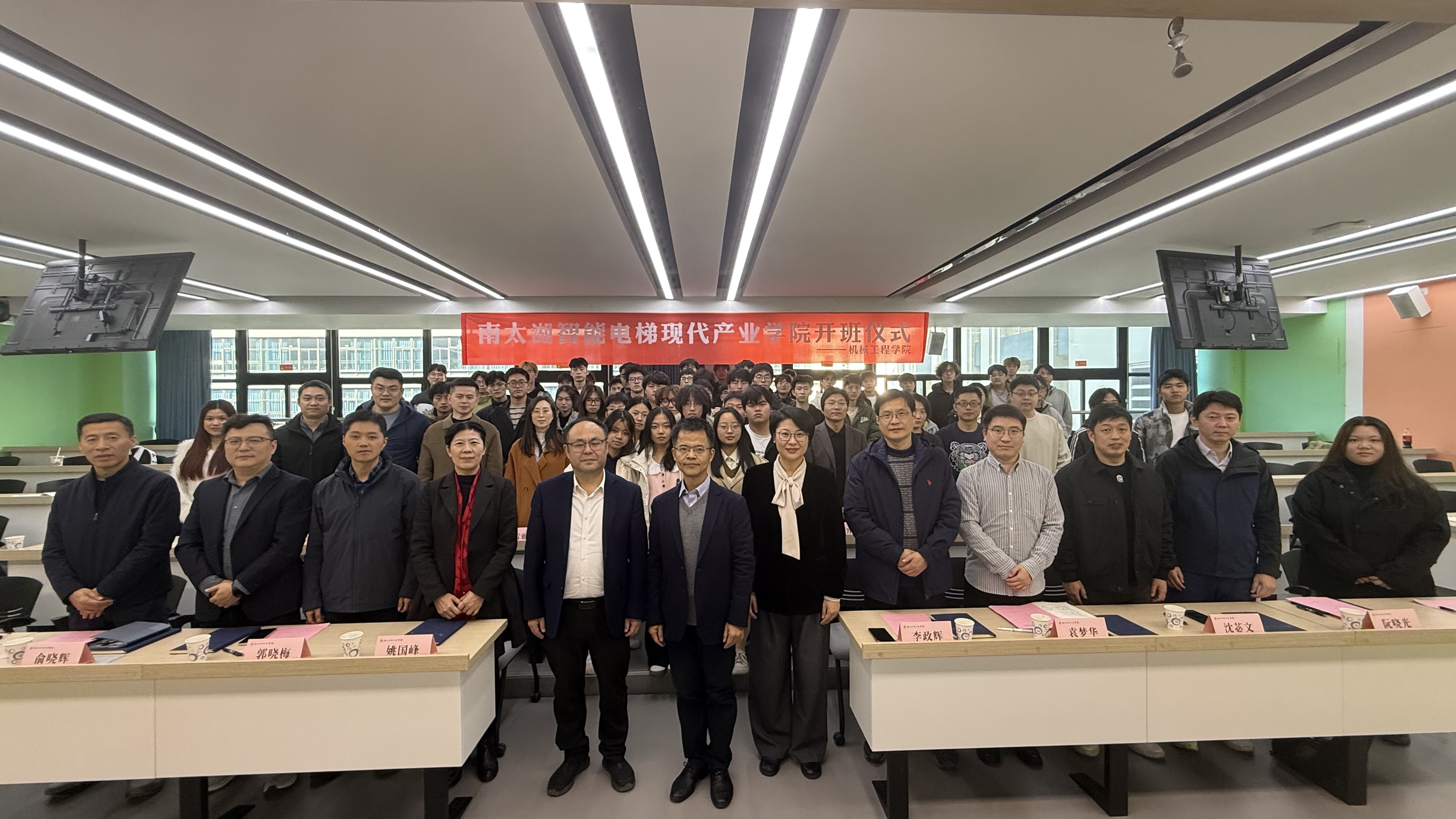 11月26日,南太湖智能电梯现代产业学院开班仪式在南浔校区博学楼举行。副校长李政辉,南浔区经信局局长姚国峰、南浔区组织部副部长袁梦华、南浔区经信局党组成员朱力、南浔区人社局主任俞晓辉,机械学院党委书记沈苾文、机械学院院长郭晓梅、教务处副处长阮晓光,产业学院参与单位代表及相关师生齐聚一堂,共同见证产业学院开班。