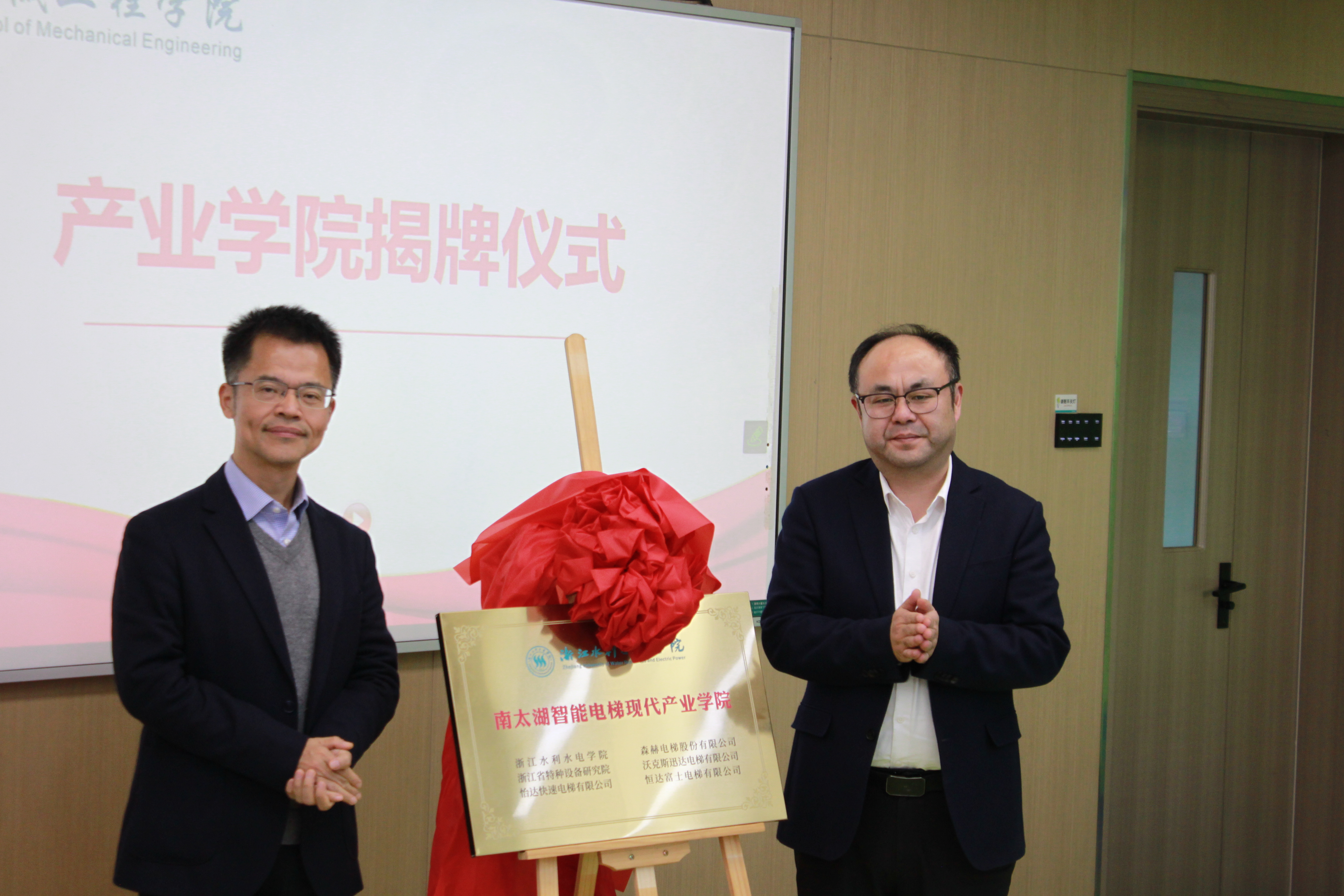 南太湖智能电梯现代产业学院由机械学院牵头,联合湖州市南浔区政府与区内五家企业共同组建,包括浙江省特种设备研究院、怡达快速电梯有限公司、森赫电梯股份有限公司、沃克斯迅达电梯有限公司、恒达富士电梯有限公司。学校将依托南浔“三电一板”产业集群优势,建成优势资源汇聚、服务区域重点产业的省级现代电梯产业学院,打造长三角地区机电产业人才培养的示范基地。