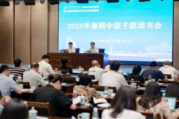 8月28-29日,学校在南浔校区举行2023年暑期中层干部读书会。会上,传达学习了省委省政府召开的高等教育强省暨高水平大学建设工作推进会议精神,围绕现代产业学院建设、本科教育教学审核评估、学科与学位点建设、学校治理、学科专业一体化建设等开展专题培训。校党委书记钱天国、校长陈光亭讲话。全体校领导、全体中层干部参加会议。