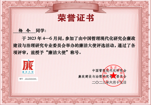 近日,由中国管理现代化研究会廉政分会、全国大学生廉洁社团网络等联合主办的2023年“廉洁大使”评选活动落下帷幕,米兰官网廉政文化社社长杨令同学被授予2023年全国大学生“廉洁大使”荣誉称号。本次评选活动在全国范围内共评选产生40位大学生“廉洁大使”。
