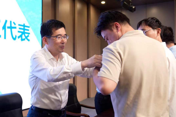 仪式在雄壮的国歌声中拉开序幕。钱天国、陈光亭等校领导为新进教职工代表佩戴校徽,象征着大家拥有了“水院人”的新身份。