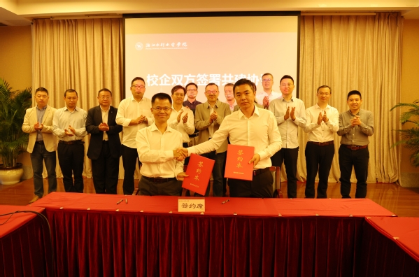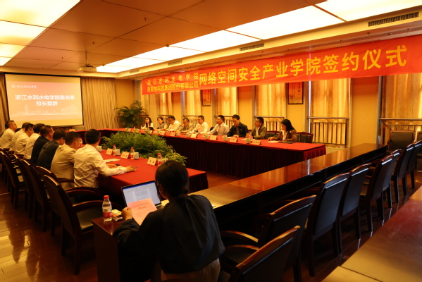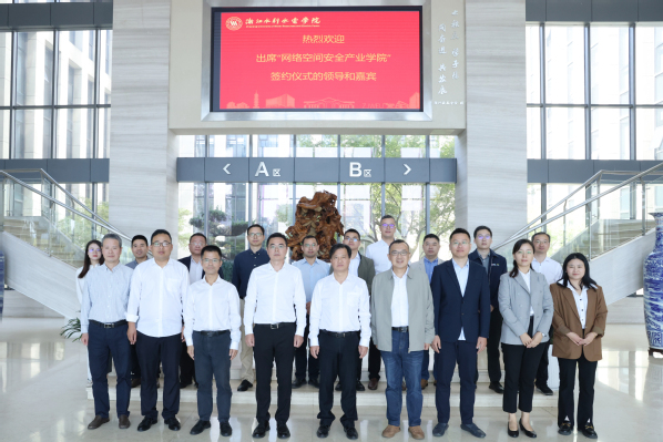 浙江省大数据发展管理局、湖州市南浔区大数据服务中心、钱塘区科学城有关领导,奇安信集团浙江分区有关负责人,学校教务处、科技处、社合处、人事处、实设处、现代教育技术中心、信息工程学院等有关部门和学院负责人现场见证产业学院成立。
