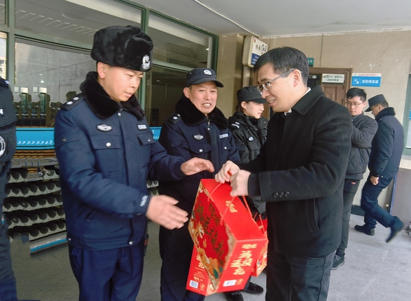 1月26日上午,校党委书记钱天国、校长万健在钱塘校区走访慰问寒假期间坚守工作岗位的教职员工和留校的留学生,并对校园安全工作进行检查。副校长沈自力,办公室、校工会、宣传部、保卫处、总务处(后勤服务中心)、学工部、实设处、国际处、水环学院、电气学院、国教学院等部门和学院负责人参加。