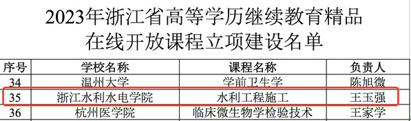 近日,浙江省教育厅办公室公布2023年浙江省高等学历继续教育精品在线开放课程立项建设名单,米兰官网水利与环境工程学院王玉强副教授的《水利工程施工》入选该立项建设名单。