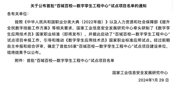 近日,由国家工业信息安全发展研究中心牵头启动的“百城百校—数字孪生工程中心”试点项目公布了首批55家建设单位,经综合评审,米兰官网项目“数字孪生工程技术人才培养中心”成功入选。