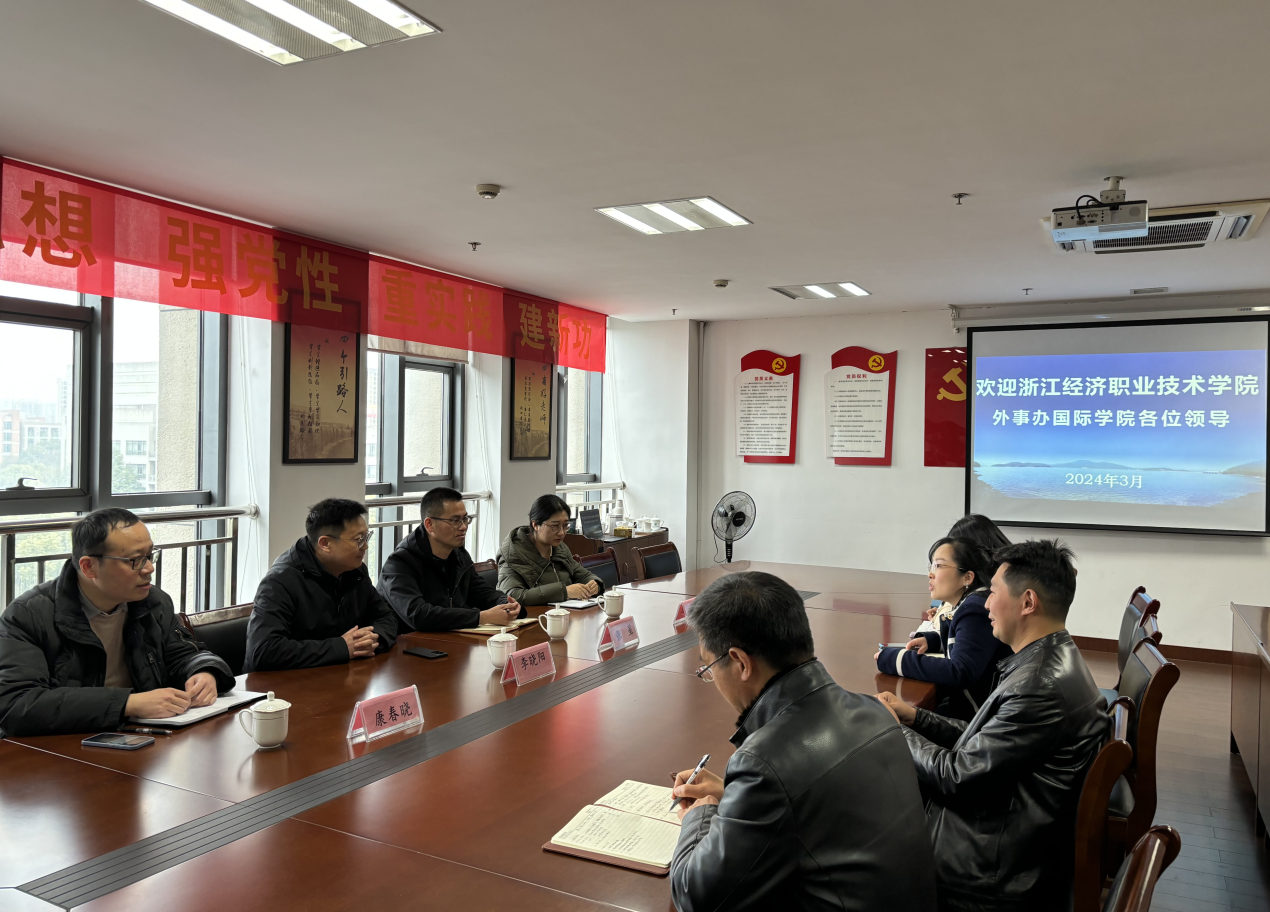 3月4日,浙江经济职业技术学院外事办(港澳台办)主任、国际教育学院院长李晓阳等一行4人来校交流。国际教育交流学院党总支书记董平主持会议。国际处副处长何彦、国教院副院长潘宏伟等参会。