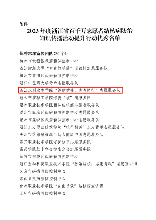近日,浙江省疾控预防控制中心、浙江省防痨协会公布2023年度浙江省百千万志愿者结核病防治知识传播获得提升行动推选结果,米兰官网“终结结核,青春同行”志愿服务队荣获全省优秀志愿宣讲团队(全省共20个)。