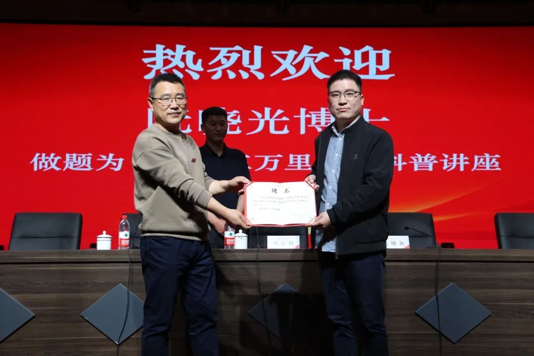 聘任仪式上,镇海中学南浔分校副校长练永林代表学校为阮晓光博士颁发了科学副校长聘书。
