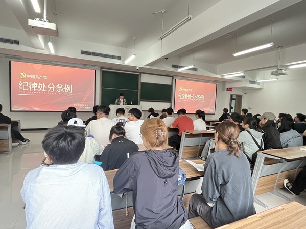 来自学生新能源党支部的宣讲员刘康勇、学生电力党支部的宣讲员胡琴对照《条例》内容,结合高校学生、学生党员等违纪违法案例等分别在23级新能源专业、电气工程及其自动化专业的班级中进行宣讲,启发同学们要牢记纪律红线、敬畏党纪法规。