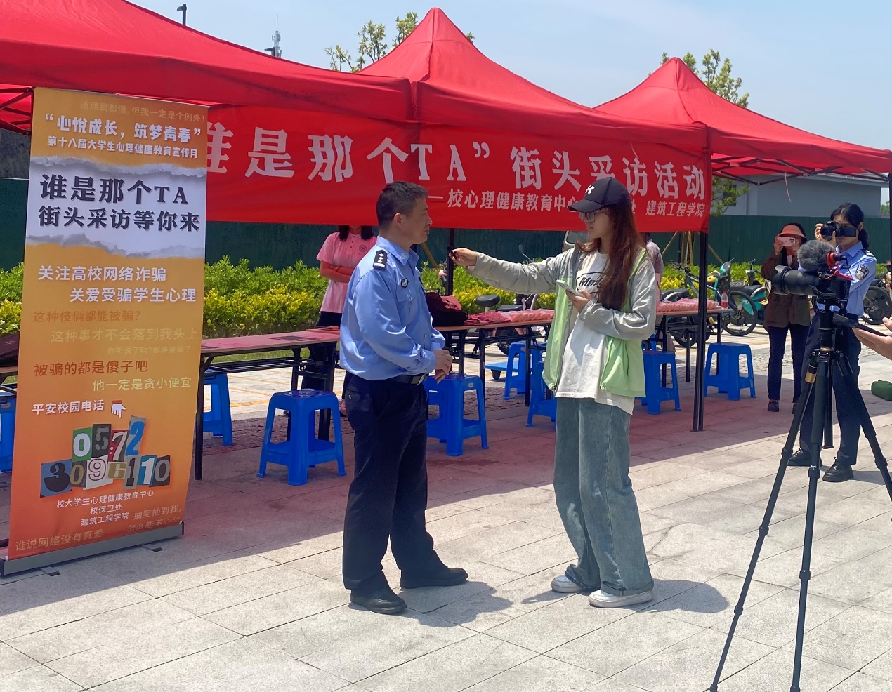 为进一步提升师生对网络诈骗的防范意识,关爱被骗学生的心理健康,5月15日,建工学院联合校保卫处、校心理健康教育中心在南浔校区西食堂门口举办了主题为“谁是那个TA”的街头反诈采访活动,通过实地采访和互动体验,让师生们深入了解网络诈骗的危害,关爱被骗学生。