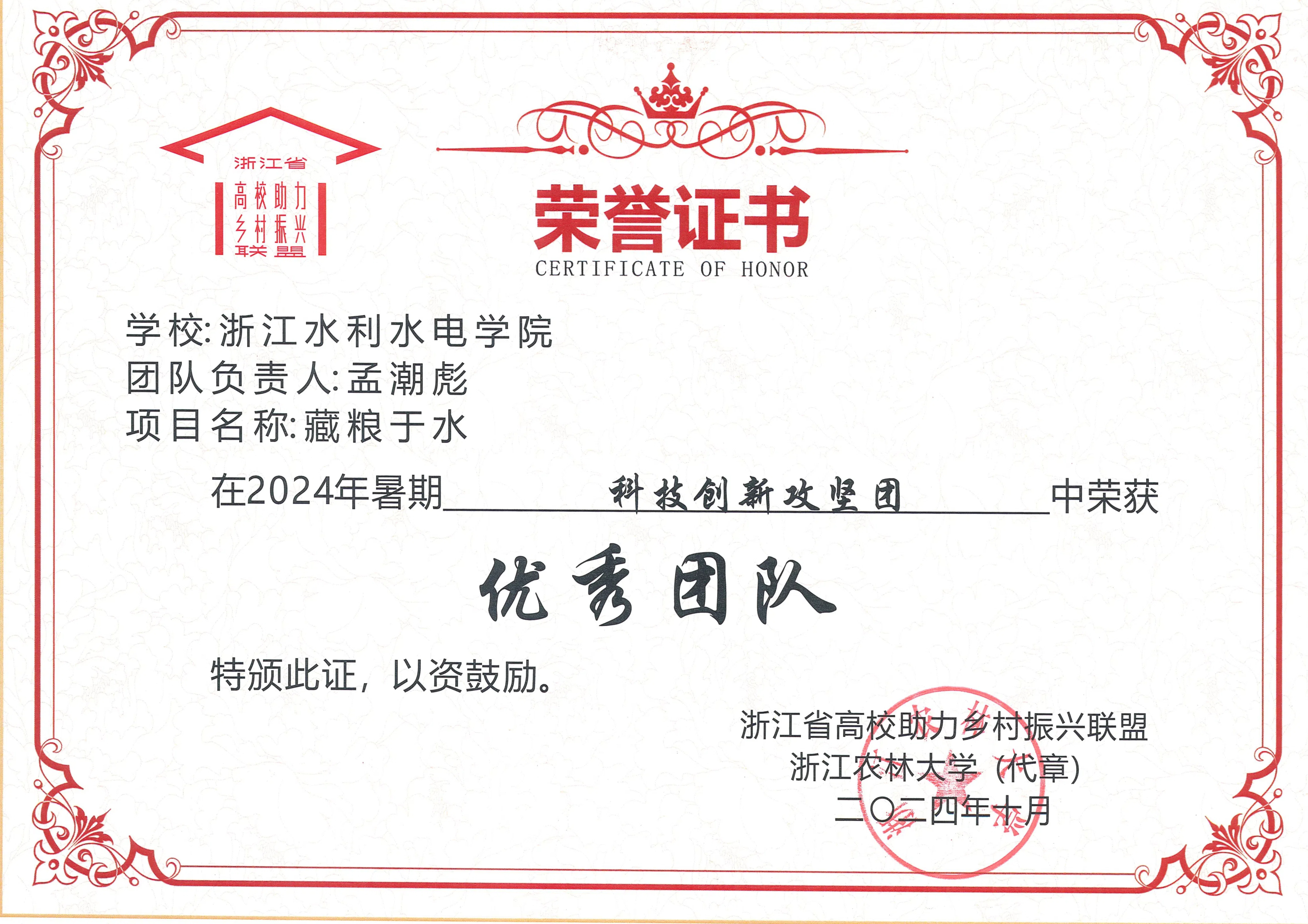 近日,浙江省高校助力乡村振兴联盟发布了2024年浙江省高校暑期服务乡村振兴工作优秀团队名单,米兰官网水利工程学院孟潮彪老师带领的“藏粮于水”实践服务团荣获“科技创新攻坚团优秀团队”称号。
