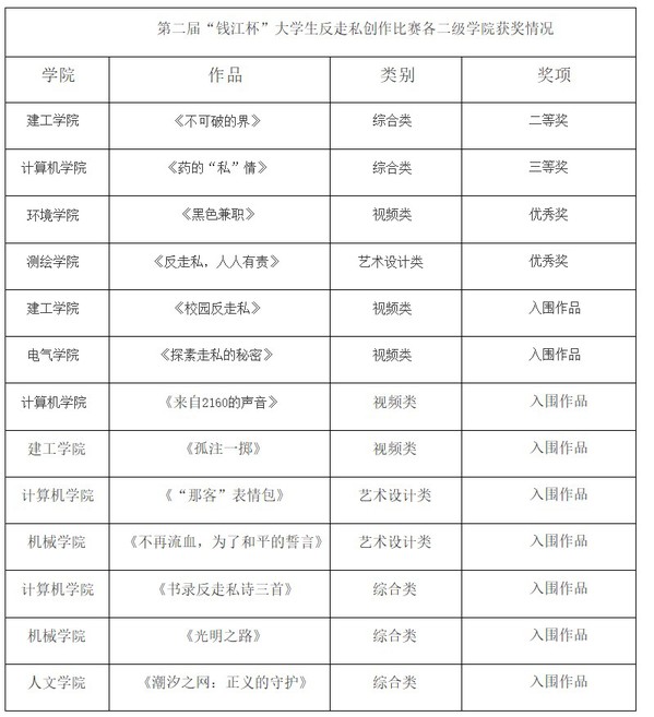 此次“钱江杯”大学生反走私创作比赛由浙江省人民政府反走私办公室、浙江省教育厅高等教育处指导,由杭州市人民政府办公厅,杭州市教育局主办,杭州市政府反走私办公室和杭州师范大学美术学院协办。本届赛事共有作品3306件参赛,最终评选出视频类、艺术设计类、综合类获奖作品及入围作品575件(其中一等奖6件,二等奖16件,三等奖30件、优秀奖130件、入围作品393件)。