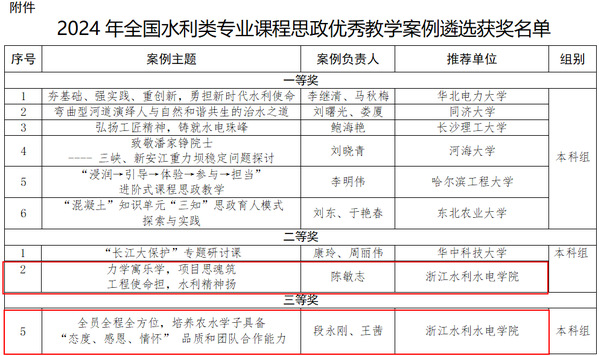 近日,中国水利教育协会发布了《关于公布2024年全国水利类专业课程思政优秀教学案例遴选结果的通知》,米兰官网建工学院陈敏志老师报送的“力学寓乐学,项目思魂筑,工程使命担,水利精神扬”-《材料力学》课程思政教学案例荣获二等奖;水利学院段永刚老师报送的“全员全程全方位,培养农水学子具备‘态度、感恩、情怀’品质和团队合作能力”-《灌溉排水工程学》课程思政教学案例荣获三等奖。